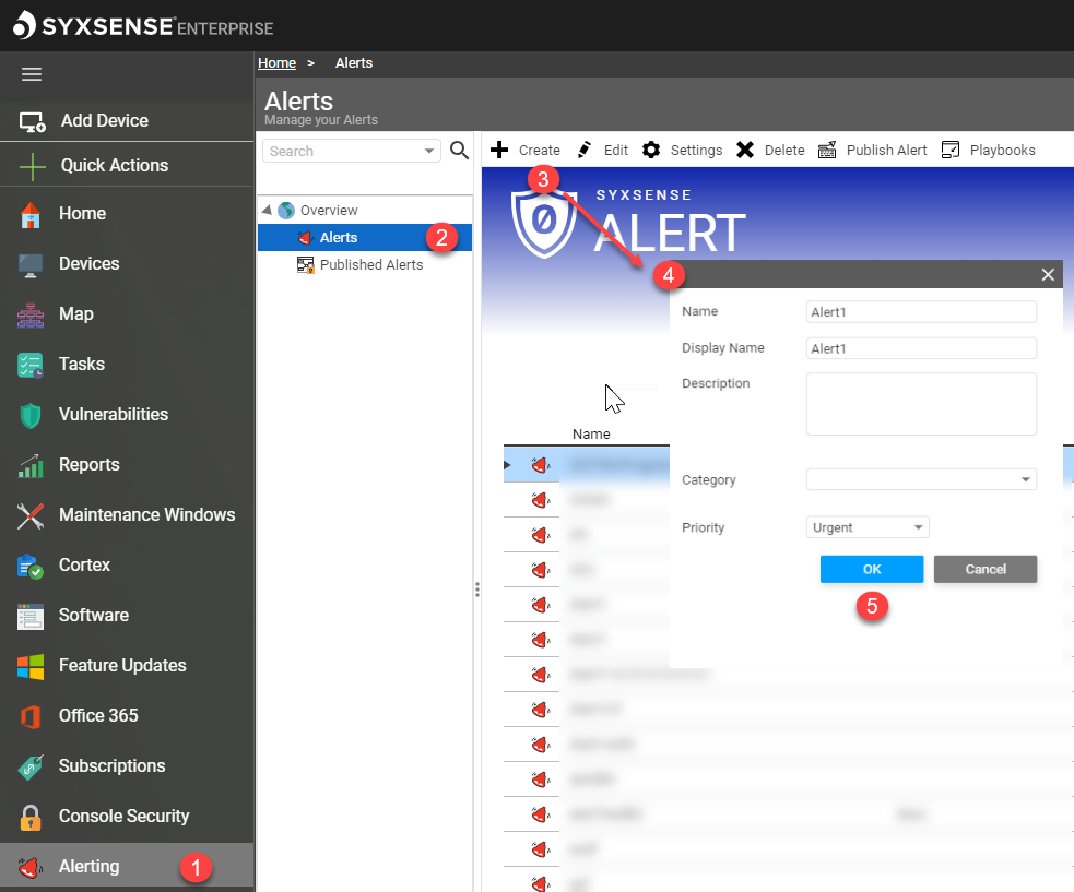 Click the Alerting tab within the Syxsense console sidebar ① Select the Alerts tab ② Click the 'Create' button ③ Define this alert with the following information: ④