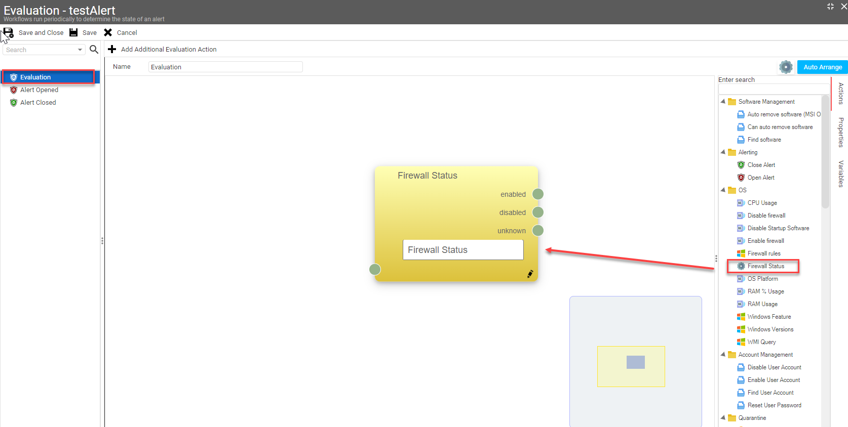 Select 'Open Alert' action from the right Actions sidebar and drag it over to the Disabled state node for the 'Firewall status' action in the canvas. This will create an alert for a device with disabled Firewall. Connect the 'Close Alert' action to the Enabled state node for the 'Firewall status' action. Drop-down TitleDrop-down Title |