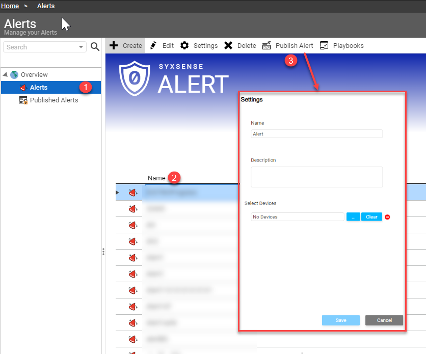 Select the Alerts sidebar tab ① Then, select the name of the Alert you want to deploy ② Next, select the Publish Alert button from the top toolbar ③ Drop-down TitleDrop-down Title ![]() |